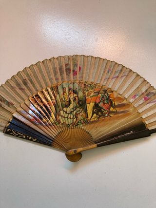 Abanico antiguo con varillas de madera y tela decorada con escenas taurinas y flamencas. - pintado por ambos lados - Diseño detallado con motivos españoles. - Varillas de madera. - Tela impresa con colores vivos. - 23 cm