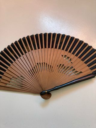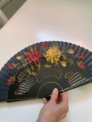 Precioso abanico antiguo de madera con un diseño pintado a mano. - Pintura floral detallada en tonos vivos. - Varillas de madera clara. - Diseño plegable y ligero. Color azul marino
