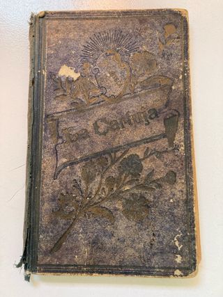 Libro antiguo con título La Cartuja y el pequeño deshollinador. Fecha de 1910. - Escrito por Cristóbal Schmid - Biblioteca Rica Moral- Recreativa - Portada con diseño floral y detalles dorados. - Encuadernación en tela azul con bastante desgaste propio del tiempo.