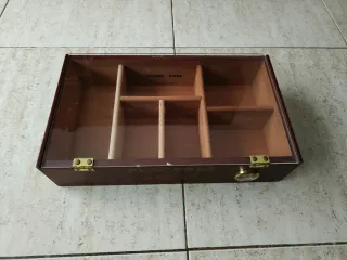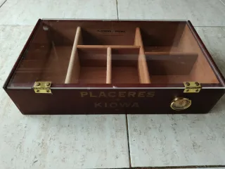 ANTIGUO HUMIDOR CAJA EXPOSITOR DE PLACERES KIOWA Medidas 40cm de largo x 28,5cm de ancho x 11,5cm de alto - Interior con divisiones de madera. - Tapa de metacrilato. - Incluye higrómetro. Ideal para coleccionistas.