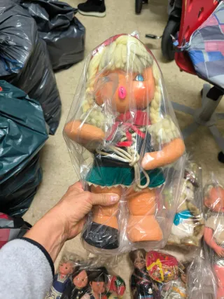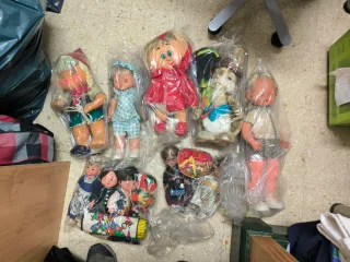 Conjunto de muñecas antiguas, algunas con sus embalajes originales. - Variedad de muñecas de diferentes tamaños y estilos. - Incluye un peluche de conejo. - Algunas muñecas conservan ropa y accesorios. - Ideal para coleccionistas. #caritas #antiguedad