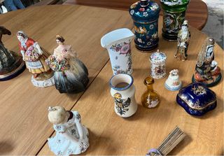 Conjunto de piezas de cerámica antiguas, incluyendo figuras y jarrones decorativos. - Figuras de porcelana con vestimenta detallada. - Jarrones con motivos florales y dorados. - Pequeña caja decorativa. - Elementos de colección variados.