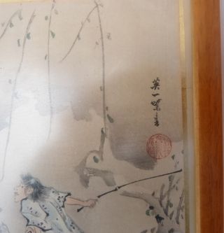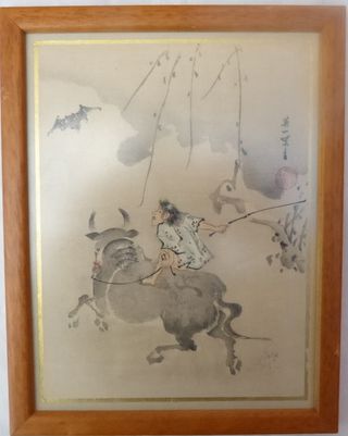 Pintura de la época Meiji/Woodblock Print of Meiji Era?, muy buen estado-2 Descripción: Una pintura, que creemos que es de la época Meiji Enmarcada En muy buen estado No lo podemos garantizar. En su dia en subasta era la descripción proporcionada en EEUU. Enmarcada por nosotros La pintura tiene minúsculos y mínimos desperfectos por los bordes Medidas incluida el marco: 27x21 cm. Aproximadamente REF:-A3 Auténtica pintura japonesa de la época Meiji. Representa a un hombre montado en un búfalo. - Estilo de grabado en madera. - Motivos tradicionales japoneses.