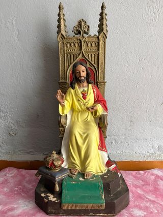 Figura religiosa del Sagrado Corazón de Jesús, estilo Cristo Rey, de Olot. Sin firma localizada. VER DETALLES. - 59cm alto trono 40cm alto hasta cabeza Cristo Base 24,5x24,5cm - Virgen, imagen, antiguedades, coleccionismo, santo