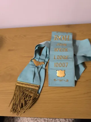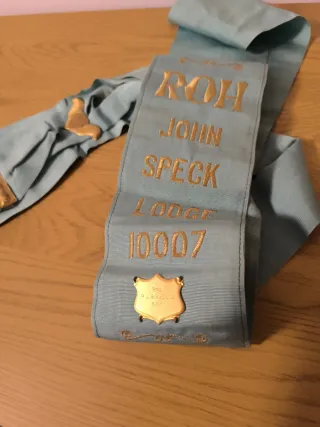 Logia de Royal Antidiluvian Order of Buffaloes. Banda de la masonería inglesa con detalles bordados dorados. - Color: Azul claro. - Inscripción: ROH JOHN SPECK LODGE 10007. - Placa dorada con inscripción. - Flecos dorados en un extremo.