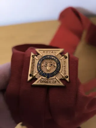 Logia de Royal Antidiluvian Order of Buffaloes Banda de presidente de la masonería inglesa, Bradford Knights Chapter N° 10, del año 1982. Con detalles dorados y flecos. - Color rojo. - Bordado dorado. - Flecos dorados.