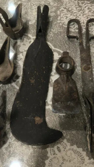 Conjunto de herramientas antiguas y candiles. - Tenazas antiguas - Escardilla de labrar antigua. - Zarcero antiguo. - Tres candiles antiguos.