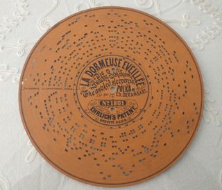 4 discos de cartón para organillo antiguo. Presentan un diseño circular con perforaciones para la música. - Título: LA DORMEUSE EVEILLEE - Subtítulo: Die erwachte Sleeperess Polka - Compositor: ED. DERANSART - Número: 1801 - Patente: EHRLICH'S PATENT BREVETE S.G.D.O. - Inscripción adicional: The beginning. Le commencement. Anfang