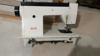 Máquina de coser de la marca Alfa. Un clásico para tus proyectos de costura. - Diseño en color blanco. - Logo de la marca en rojo.