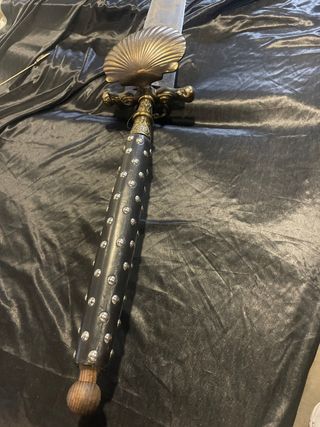 Espada decorativa inspirada en Sancho Dávila y Daza, con una longitud total de 114 cm. El mango está forrado en cuero negro y adornado con tachuelas plateadas, culminando en un pomo de madera. La guarda presenta un diseño ornamentado con una concha dorada. - Longitud total: 114 cm. - Mango forrado en cuero negro con tachuelas. - Pomo de madera. - Guarda con detalle de concha dorada.