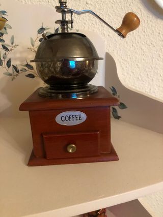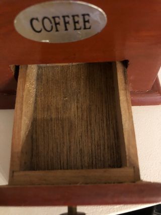 Molinillo de café de estilo vintage con base de madera y depósito metálico. - Diseño clásico. - Etiqueta frontal COFFEE. - Cajón extraíble.