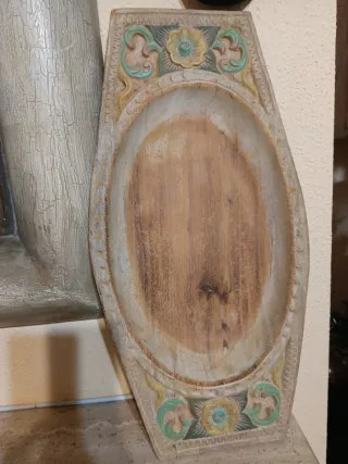 Bandeja antigua de madera con un diseño tallado y decorado. - Bordes con motivos florales y vegetales. - Colores verde y amarillo en la decoración. - Superficie interior de madera con vetas. - Forma ovalada alargada. - También se puede colgar. Mide 50,5 de largo, 25 de ancho. Encima de caja Ikea 2