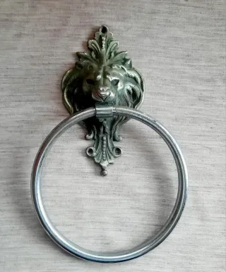 Antiguo toallero decorativo con diseño de cabeza de león. 20 x 11 cm. Década 1970. - Material metálico, probable alpaca. - Anilla circular, removible, para colgar la toalla. Ø 19 cm.