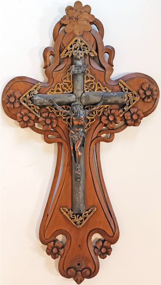 Cristo crucificado, montado sobre plafón de madera tallada (de colgar). Estilo modernista / “Art Nouveau” (principios del siglo XX) Trabajado; tanto la madera como el metal Falta: la benditera de metal inferior, y el rosetón superior (ver fotos) Medidas aprox: 41 x 23 cm Peso: 359 g
