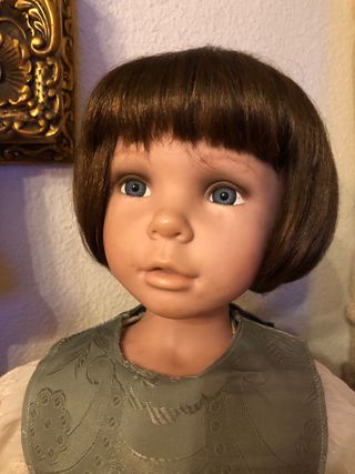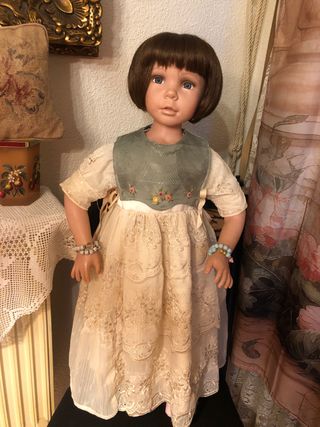 Preciosa muñeca vintage de gran tamaño, con un vestido confeccionado a mano. - Vestido de encaje color crema. - Chaleco decorado con flores bordadas. - Brazaletes en las muñecas.