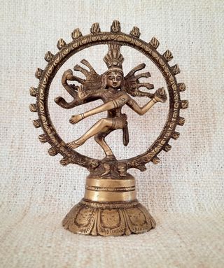 Antigua estatuilla de bronce del dios hindú Shiva, en la forma de Nataraj, el rey de la danza. Hecha en India con la técnica de la cera perdida y un detallado trabajo de cincelado. Simbolismo: el dios Shiva baila la danza cósmica dentro de un círculo de fuego aplastando al demonio de la ignorancia. Representa el ciclo de creación, destrucción y regeneración, y los procesos de transformación interior necesarios para la evolución humana. Medidas: alto 14,5 cm, ancho 11,5 cm. Peso 328 g.