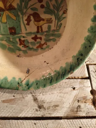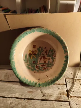 Antiguo lebrillo de cerámica portuguesa con un diseño pintado a mano. Barro cocido y esmaltado. Tuvo una parte rota que fue pegada. Mirar bien las fotografías de los detalles. Colores verde, rojo ingles y amarillo. Fondo de color hueso. Medida 23 cm de diámetro y 8 cm de altura. - Borde decorado en verde. - Motivo central de molino y ave. - Pieza decorativa con encanto.