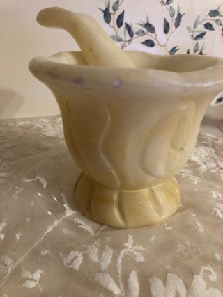 Este mortero de mármol es una pieza decorativa y funcional. - Material: Mármol - Color: Blanco y amarillo veteado - Incluye mano para machacar