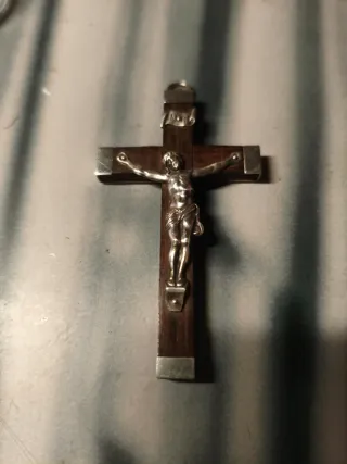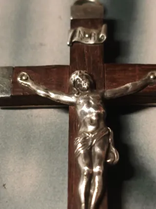 Antiguo crucifijo francés con cristo en plata y cuerpo de madera. Medida 7x4cm. - Diseño clásico. - Materiales: madera y plata.