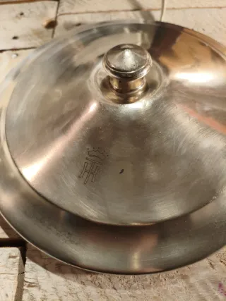 Elegante tapa antigua de metal con baño de plata. Su diseño clásico la hace un accesorio decorativo o funcional. Tapa de fuente para servir alimentos. Logotipo de hotel grabado. Pomo para agarrar. Años 20/30. Diámetro 21,5 cm. - Material: Metal con baño de plata o alpaca. - Diseño: Clásico y ornamental. B. No soy experta en plata. Hago fotos de contraste si los tiene el objeto. No admito devoluciones de objetos de plata si luego resulta no ser la plata que usted esperaba. Para cualquier consulta hay un chat aquí para dialogar. Puedo enviar más fotos por WhatsApp.