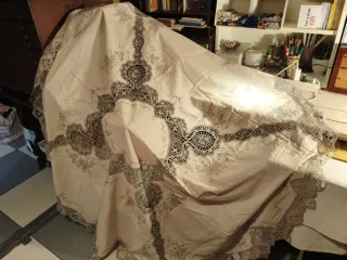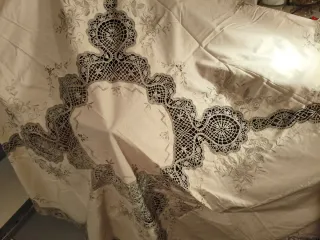 Elegante mantel vintage con intrincado bordado. Circular. En perfecto estado. Años 50/60. Diámetro 170 cm. Bordado central y bordados por cuadrantes. Delicada puntilla de encaje de crochet perimetral. - Diseño clásico con bordado de Madeira en color gris plata. - Tejido hilo color hueso de alta calidad. - Aporta un toque de distinción a cualquier mesa. B. C167
