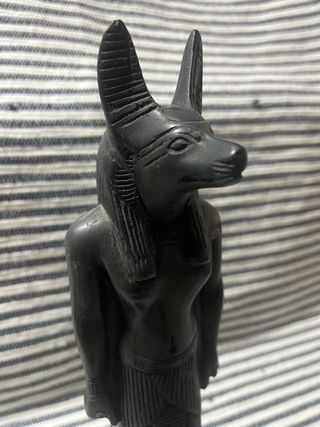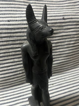 Figura decorativa de Anubis, el dios egipcio con cabeza de chacal. Representa la protección y la vida después de la muerte. - Material: Piedra artificial. - Color: Negro. - Diseño detallado.