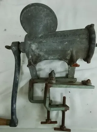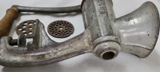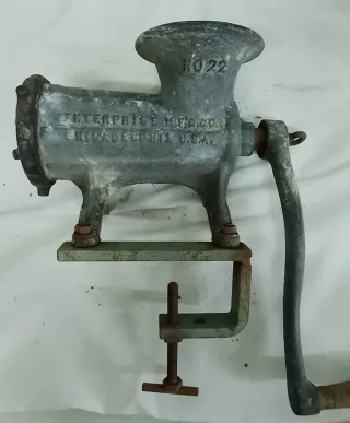 Picadora de carne antigua marca Enterprise MFG. Co. - Modelo No. 22. - Fabricada en Filadelfia, USA. - Cuerpo de aluminio. - Antigüedad aprox: 65 años. Medidas aprox.: 35x35x15cm MODELO DE IMPORTACIÓN MUY POCO COMÚN. Usado en carnicería. Tamaño superior al doméstico. Presenta una rotura en una de las patas de sujeción. Le falta el aspa de picar. Vendo como antigüedad. No apto para su uso. Con envío disponible No acepto devoluciones