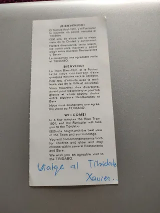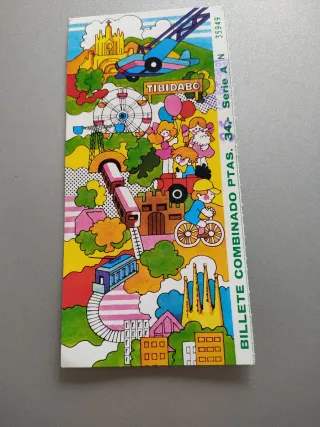 Antigua entrada para el parque de atracciones Tibidabo. Presenta un diseño colorido con ilustraciones de atracciones y monumentos. Escrita en el reverso como se aprecia en la foto - Ilustraciones de un avión, noria, tren y la Sagrada Familia. - Texto TIBIDABO destacado. - Inscripción BILLETE COMBINADO PTAS. 34.- Serie A N 35949 en el lateral.