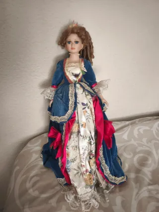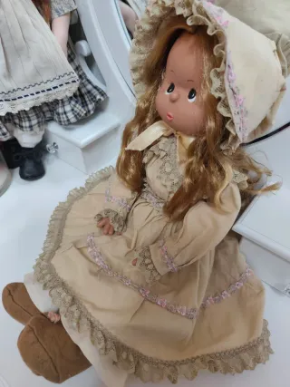 Muñecas de porcelana años 80/90 con extremidades de parcelana y cuerpo de tela, base de madera para exponerlas de pie.Una de ellas con sofá vintage, tamaño de muñecas entre 40 y 60 cm, muñecas de coleccionismo.Precio a negociar !