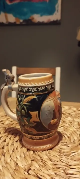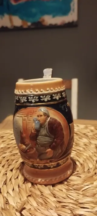 Jarro de cerveza con diseño tradicional. - Cerámica con detalles pintados a mano. - Escena de un hombre bebiendo. - Borde superior decorado.