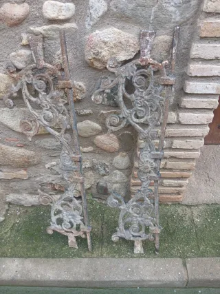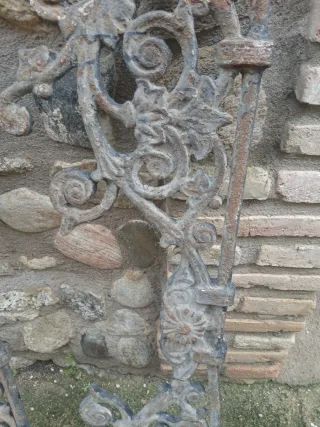 Conjunto de dos adornos decorativos de hierro forjado con un diseño floral y de volutas, usados en el alto de una antigua puerta o reja seguramente. - Material: Hierro forjado. - Estilo: Antiguo, ornamental. - Color: Gris oscuro con toques de óxido. 100x30 100e cada uno