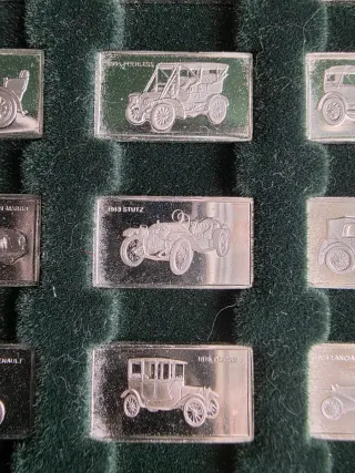 Edición limitada publicada en la década de 1980. Conjunto de 100 placas de plata con grabados de autos antiguos de Franklin Mint. Cada placa representa un modelo clásico diferente de los autos más famosos del mundo, muy precisos y detallados. - Material: Plata. - Marca: Franklin Mint. - Temática: Automóviles clásicos. - Cantidad: 100 unidades. - Medidas placas: 1,6cm x 1cm - Peso placas: 1,1 gramos cada una Escucho ofertas.