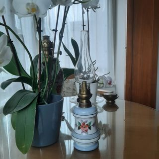 Quinque frances tipo "valentine" de porcelana. Deposito: blanco, azul y con flores pintadas a mano Quemador de laton KOSMOS BRENNER. Tubo chimenea de cristal abombado en su parte inferior de 3,5 cm y 20 cm de longitud. Altura quinque: 23 cm. Altura total com el cristal: 40 cm. Aunque en buen estado este quinque es para DECORACION.