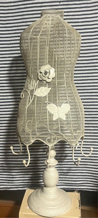 Maniquí decorativo de estilo antiguo, perfecto para exhibir o como pieza de decoración. - Diseño de alambre con detalles de flor y mariposa. - Color blanco roto. - Base y soporte incluidos. - 67 x 27 y 1.564 g