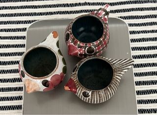 Conjunto de tres hueveras decorativas con forma de pájaro, estilo vintage. - Diseño de pájaro con pico y cola. - Interior en color verde oscuro. - Uno con flores y hojas pintadas. - Otro con estampado de cuadros rojos y marrones. - El tercero con rayas verticales grises. - Medida 8,5 cm peso 139 g ( 46 g c:u)