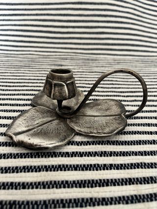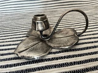 Elegante candelabro antiguo con un delicado diseño inspirado en la naturaleza. - Elaborado en plata. - Base con forma de hoja. - Soporte para vela con asa curva. - Peso 239 g