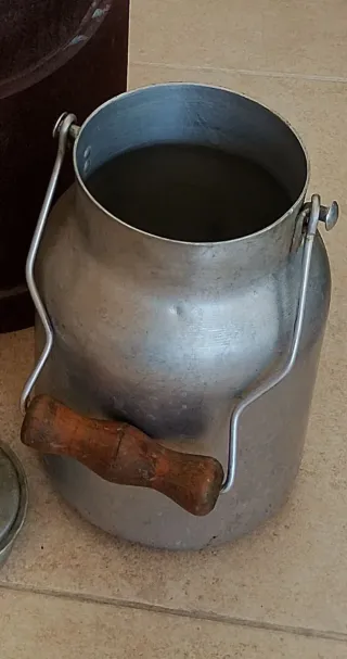 Cantina de leche antigua, ideal para coleccionistas o decoración. - Material: Aluminio - Asa de madera. - Diseño clásico. - Le falta la tapa. - Medidas aprox: 25x18cm Con envío disponible. No acepto devoluciones