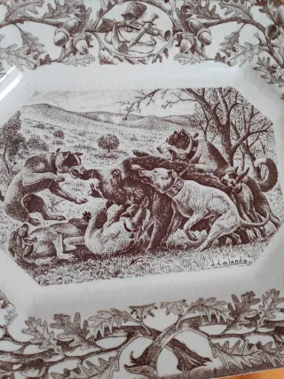 Fuente octogonal La Cartuja de Sevilla firmada por J. Lalanda. Fuente de cerámica de La Cartuja de Sevilla con el conocido diseño de "Caza" (o "Caza Mayor"), también identificado como la Serie 202 Marrón. Este diseño presenta una escena cinegética central detallada y un borde ornamentado con hojas de roble y bellotas. Esta es una Fuente octogonal de loza antigua una pieza de coleccionista. La empresa, fundada en Sevilla en 1841 por Charles Pickman, fue una de las principales productoras de loza fina en España -Marca: La Cartuja de Sevilla Pickman S.A. -Firma: Josechu Lalanda. -Epoca: Año 1980. -Material: Cerámica.