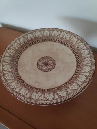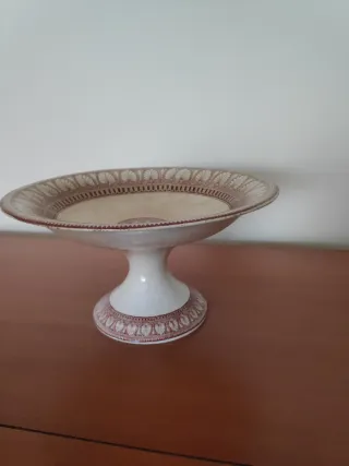 Frutero de La Cartuja de Sevilla-Pickman S.A. -Epoca: Corresponde a una marca de fabricante utilizada específicamente entre finales del siglo XIX y principios del XX. Periodo estimado: El uso de "Pickman y Cía." en este formato de doble círculo se sitúa frecuentemente entre 1880 y 1899. -Material: Loza fina esmaltada, conocida comercialmente como "China Opaca", y que imitaba la apariencia de la porcelana china, siendo más resistente y opaca. -Diseño: Es un frutero o soporte de postres (tartas) de pie Alto. Decorado con cenefas de dibujos repetitivo. -Dimensiones: 25 cmtrs de Diámetro/Ancho x 13 cmtrs de Alto x 12 cmtrs de Base.