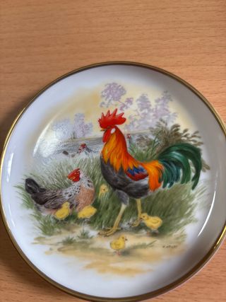 Precioso plato de porcelana de la marca Kaiser, una pieza única con un diseño pintado a mano y numerado. - Diseño de gallo, gallina y pollitos. - Borde dorado. - Firmado por el artista.
