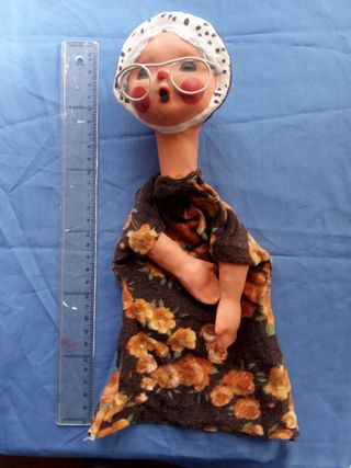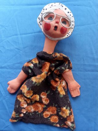 Bonita marioneta de mano de la abuelita de Caperucita, o cualquier otro cuento. Títere artesanal de unos 30 cm. Cartón piedra y yeso pintado, cuerpo de tela, pelo de lana y gafas de alambre. Pintada a mano. Años 70. Perfecto estado Antigua vintage, retro, egb #yofuiaegb #marionetavintage #marioneta #títere #puppets