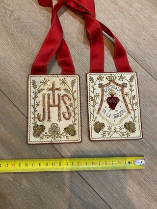 Escapulario bordado con hilo dorado y detalles en rojo. Muy antiguo y en perfecto estado , bordado en oro , lentejuelas y canutillo . - Diseño con las iniciales JHS y una cruz. - Otro escapulario con el Sagrado Corazón y la inscripción APOSTOLADO DE LA ORACION. - Ribete y cintas rojas. Ideal para virgen , cristo, dolorosa...