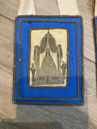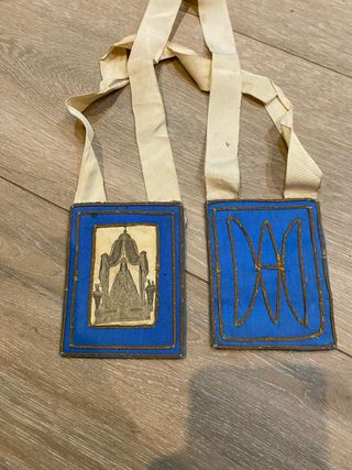 Antiguo escapulario con dos partes, una con una imagen y otra con un símbolo. - Escapulario con imagen de una figura bajo un dosel. - Escapulario con símbolo bordado en hilo dorado. - Correas de tela para colgar.