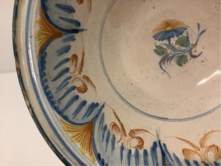 Lebrillo de cerámica de Ribesalbes con diseño de la serie Tricolor. Presenta un interior decorado con motivos florales y un borde exterior con un patrón de volutas en azul y ocre. - Cerámica pintada a mano. Principios siglo XX - Diseño floral central. - Borde decorado con volutas. - Medidas 35 cm de diametro x 16 cm de altura