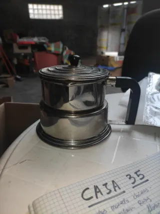 Cafetera antigua de la marca Crespo, modelo C35. Fabricada en metal plateado con un diseño clásico. - Cafetera de metal plateado. - Modelo C35.