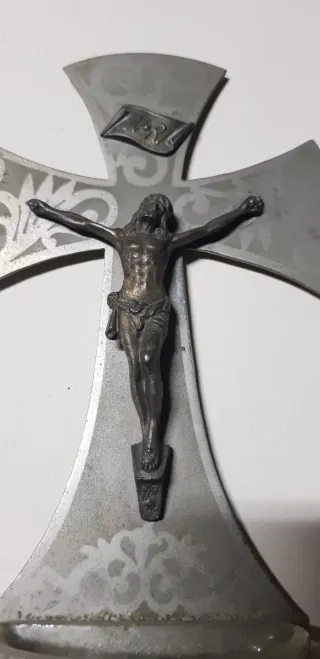 Crucifijo de pared con figura de Cristo y pila para agua bendita. - Diseño de cruz con grabados. - Figura de Cristo en metal. - Pila de vidrio. - Inscripción INRI en la cruz. W3
