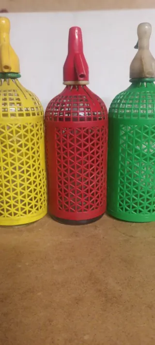 Conjunto de tres sifones de vidrio con fundas protectoras de plástico de colores. Ideal para bares PRECIO LOTE 10 euros -Sifón amarillo - Sifón rojo - Sison verde