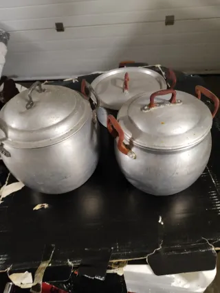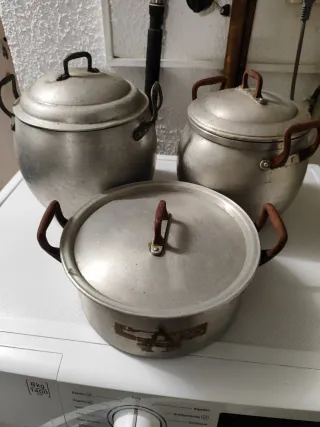 Set de tres ollas de aluminio de estilo antiguo. Perfectas para coleccionistas o para dar un toque vintage a tu cocina. - Material: Aluminio. - Diseño clásico con asas. - Incluye tres tamaños diferentes.
