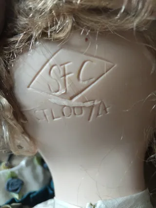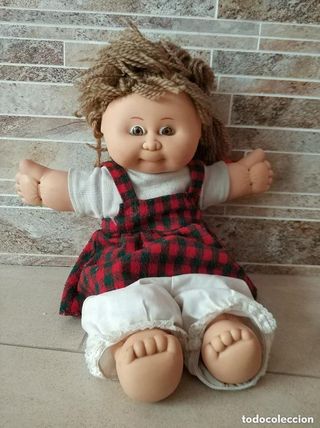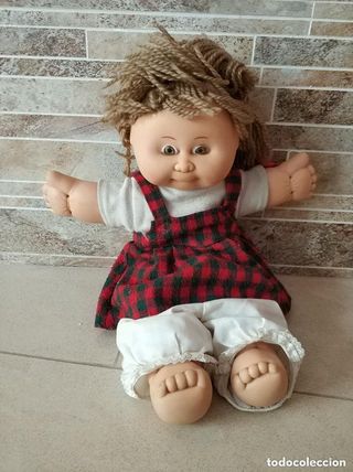 Muñeca antigua de la marca Famosa, modelo Cabbage. - Vestido a cuadros rojos y verdes. - Pantalones blancos con volantes.