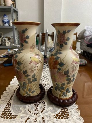 Par de jarrones de estilo chino antiguo, con un diseño floral detallado. Cada jarrón está montado sobre una base de madera tallada. - Diseño pintado a mano con motivos florales y aves. - Acabado en tonos crema y terracota. - Bases de madera oscura incluidas.
